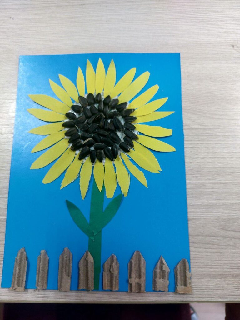 «Летнее настроение». Занятия творчеством с детьми являются прекрасным поводом рассказать им много полезного. Выполняя аппликацию «Подсолнух» воспитатель Ибраева Д.К. рассказала детям о полезных свойствах этого растения. С помощью бумаги, клея, ножниц и семечек подсолнуха у ребят получились интересные работы!