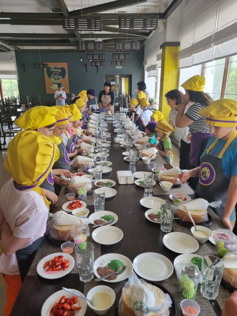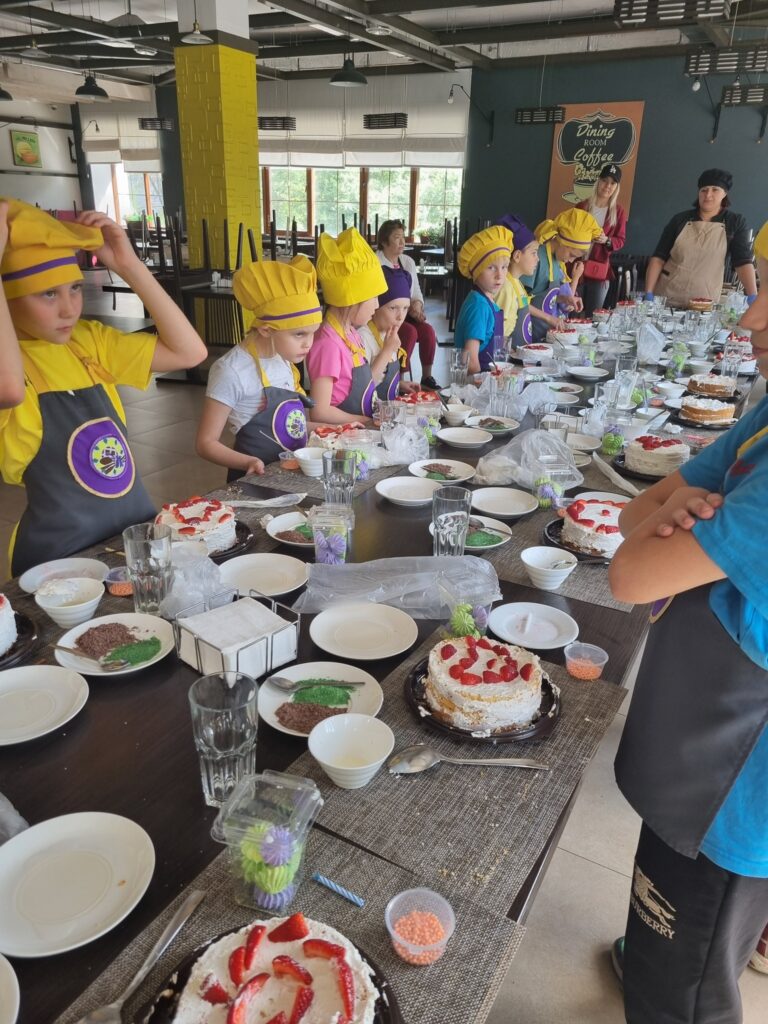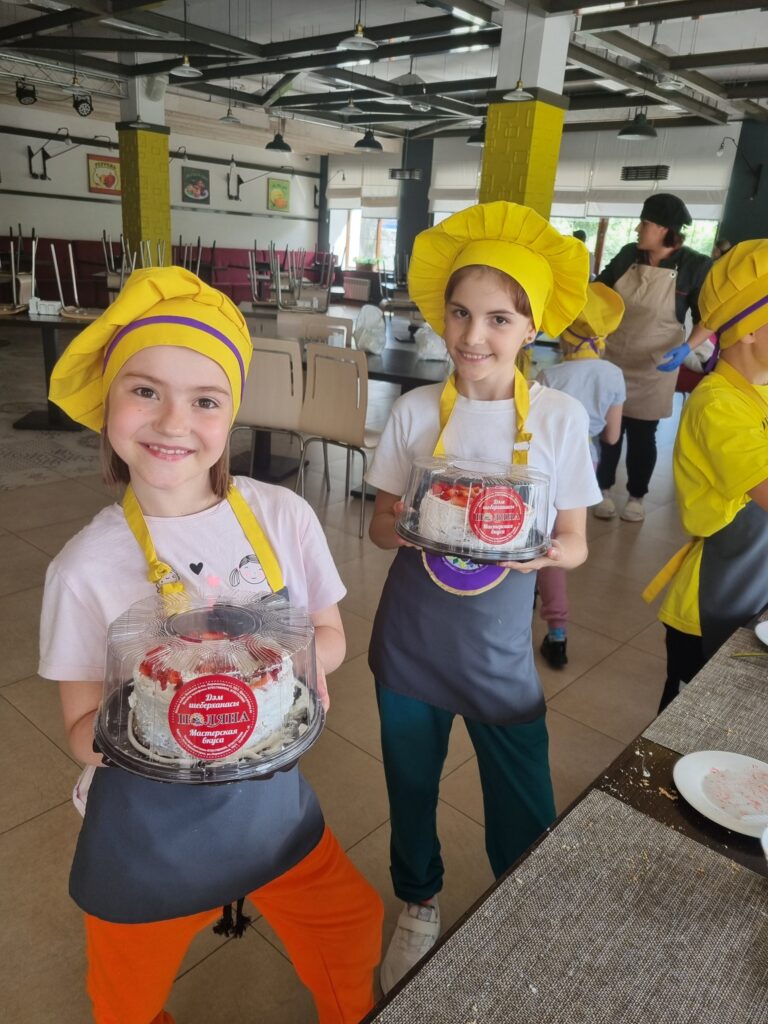 А после обеда нас ждали в кафе «Поляна» на интересный мастер-класс: «Изготовление торта «Молочная девочка» и молочного коктейля». Ребята сами вручную собирали каждый свой торт, наносили крем, украшали на свой вкус, где проявили таланты и творчество. И в конце каждый ребенок приготовил себе молочный коктейль. Получилось и красиво, и вкусно.