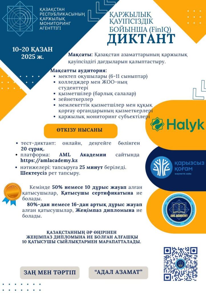 2025 жылғы 10–20 қазан аралығында ҚР Қаржы мониторингі агенттігі «AMANAT» партиясымен және «Қазақстан Халық банкі» АҚ-мен бірлесіп, AML ACADEMY платформасында қаржылық қауіпсіздік бойынша республикалық ТЕСТІЛЕУДІ өткізу жоспарлануда.